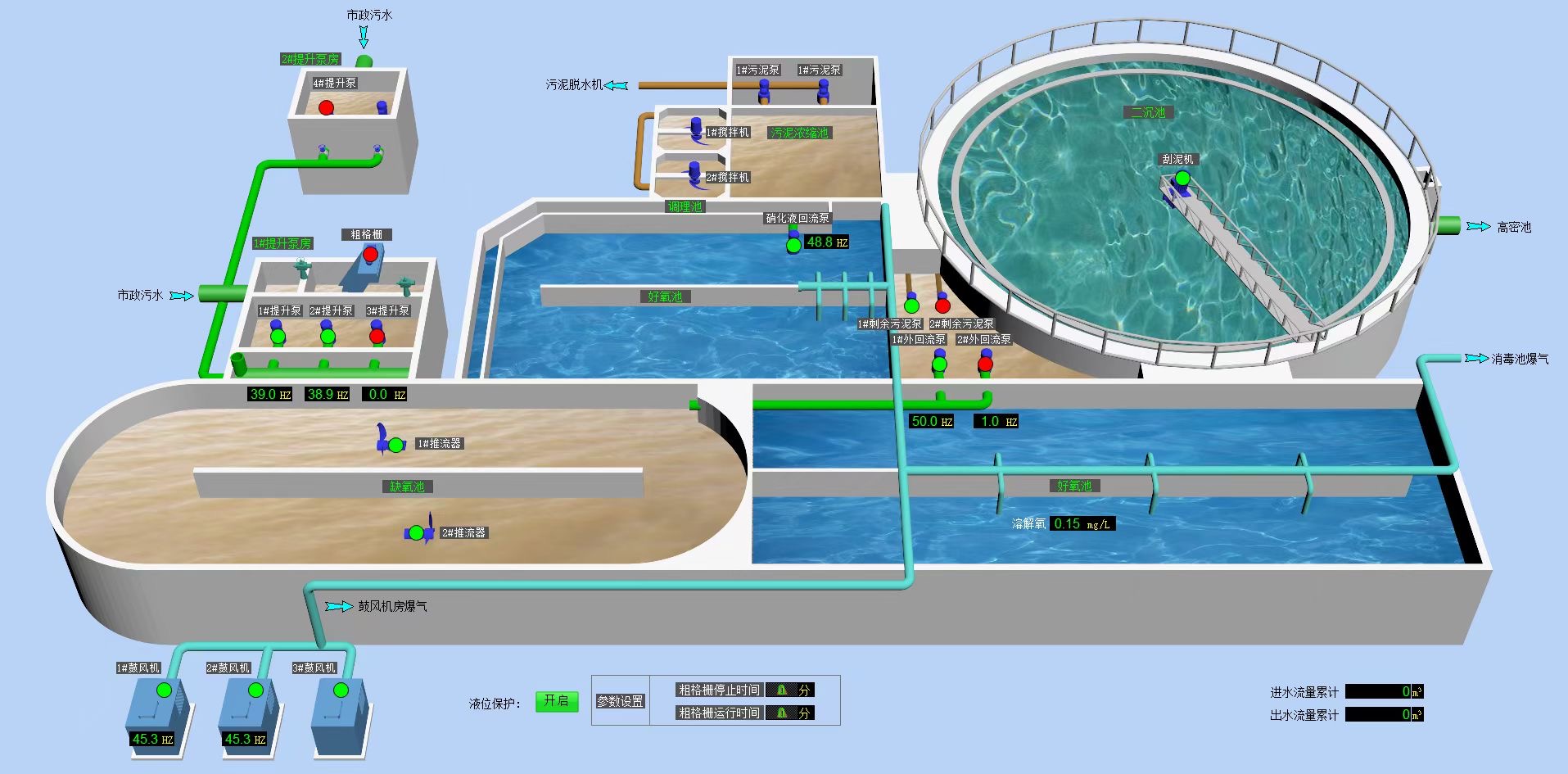 (1)工藝流程監(jiān)控功能。系統(tǒng)能按工藝要求對污水處理的各環(huán)節(jié)參數(shù)及設備狀態(tài)進行監(jiān)視,同時根據(jù)工藝要求選擇自動、順序、定時等控制方式。